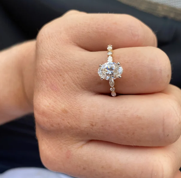 Advised by Moi Moi, she eventually settled on an oval-cut 1.67 carat white centre diamond flanked by an alternating combination of four small marquise-cut diamonds and four small round-cut diamonds – adding up to a total of two carats. The central diamond came with a third-party grading report confirming the stone’s colour, clarity, carat, weight and cut.